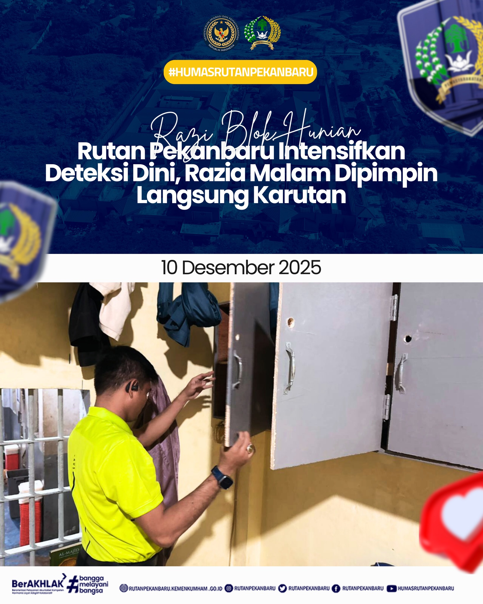 Pekanbaru — Dalam rangka menjaga keamanan serta mencegah potensi gangguan ketertiban di lingkungan Rutan, Rumah Tahanan Negara (Rutan) Pekanbaru melaksanakan kegiatan Penggeledahan/Razia Kamar Hunian pada pukul 20.00 WIB. Kegiatan ini […]
