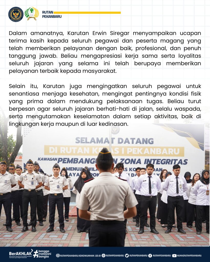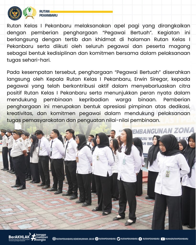 Rutan Kelas I Pekanbaru melaksanakan apel pagi yang dirangkaikan dengan pemberian penghargaan “Pegawai Bertuah”. Pada kesempatan tersebut, penghargaan “Pegawai Bertuah” diserahkan langsung oleh Kepala Rutan Kelas I Pekanbaru, Erwin Siregar, kepada pegawai yang telah berkontribusi aktif dalam menyebarluaskan citra positif Rutan Kelas I Pekanbaru serta menunjukkan peran nyata dalam mendukung pembinaan kepribadian warga binaan