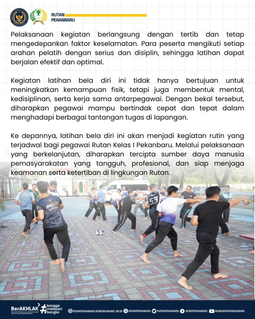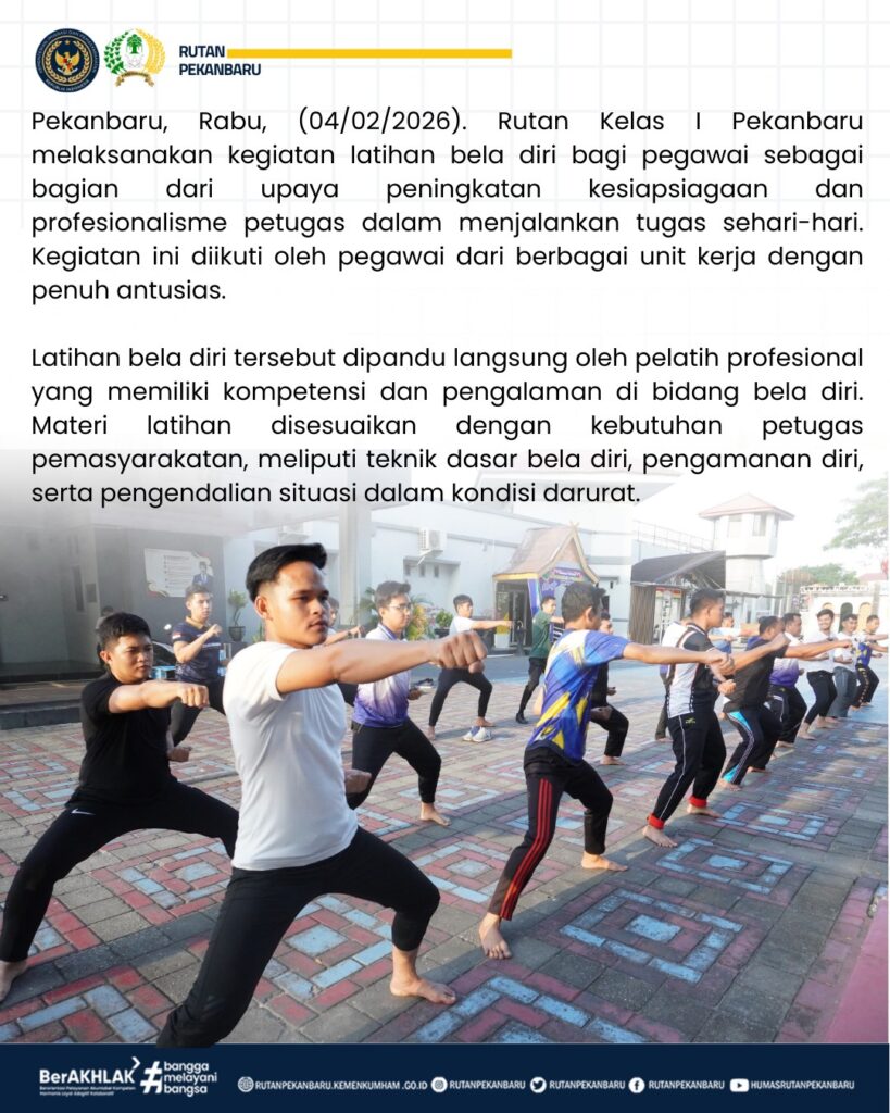 Pekanbaru, Rabu, (04/02/2026). Rutan Kelas I Pekanbaru melaksanakan kegiatan latihan bela diri bagi pegawai sebagai bagian dari upaya peningkatan kesiapsiagaan dan profesionalisme petugas dalam menjalankan tugas sehari-hari. Kegiatan ini diikuti oleh pegawai dari berbagai unit kerja dengan penuh antusias.