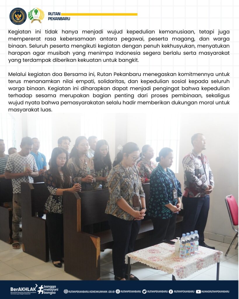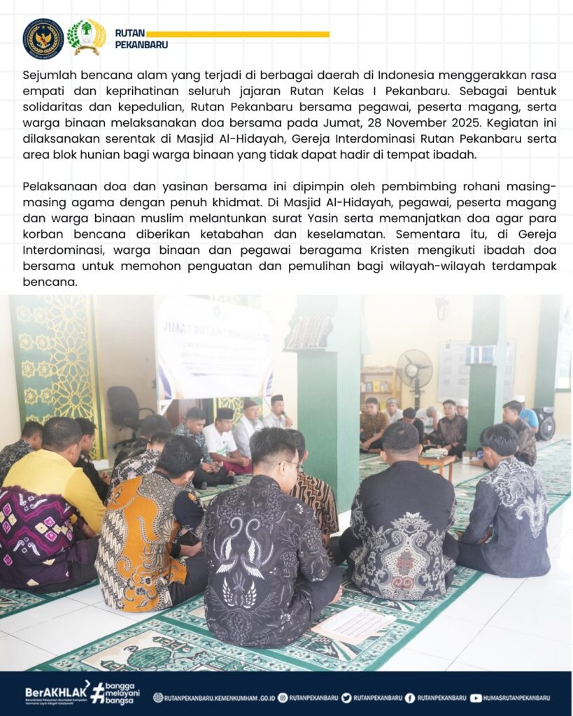 Sejumlah bencana alam yang terjadi di berbagai daerah di Indonesia menggerakkan rasa empati dan keprihatinan seluruh jajaran Rutan Kelas I Pekanbaru. Sebagai bentuk solidaritas dan kepedulian, Rutan Pekanbaru bersama pegawai, peserta magang, serta warga binaan melaksanakan doa bersama pada Jumat, 28 November 2025. Kegiatan ini dilaksanakan serentak di Masjid Al-Hidayah, Gereja Interdominasi Rutan Pekanbaru serta area blok hunian bagi warga binaan yang tidak dapat hadir di tempat ibadah.
